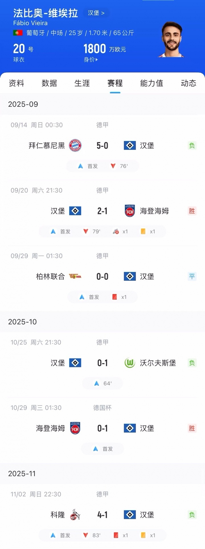 11月03日讯 德甲第9轮科隆4-1完胜汉堡,阿森纳租将法比奥-维埃拉再度染红,本赛季出战5轮德甲依然拿到2张红牌,同时数据则为0球1助。