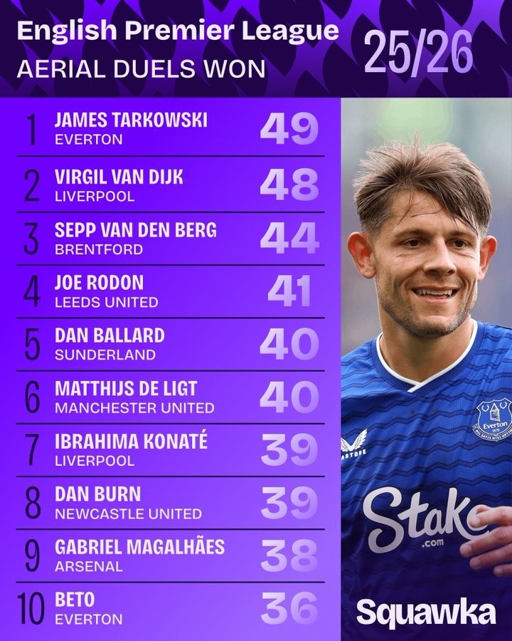 11月11日讯 英超联赛仍是进行了11轮,squakwa也统计了本赛季英超空中得手造反次数,塔科夫斯基力压范戴克居首。