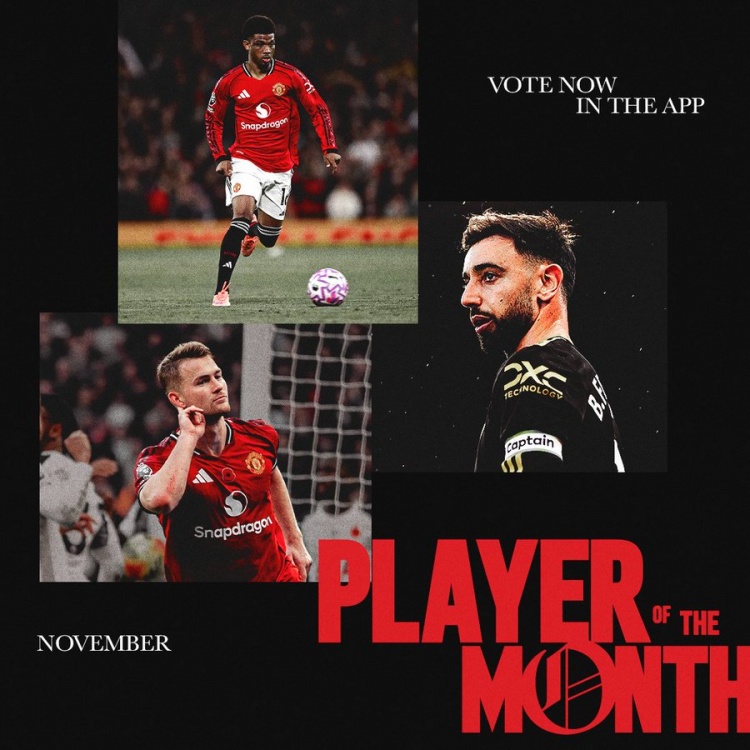 12月2日讯 曼联官方公布11月队内最好候选,阿玛德、B费、德里赫特三名球员入围。