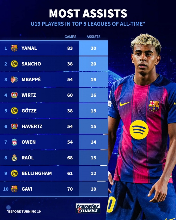 五大联赛历史U19球员助攻榜:亚马尔30助最多,桑乔20助次席