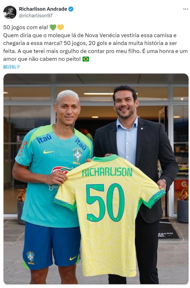 理查利森晒出与牵记球衣的合照,配文:“为国度队出战50场比赛!💚💛谁能念念到阿谁来改过维尼西亚的孩子会穿上这件球衣,并达到这一里程碑?”