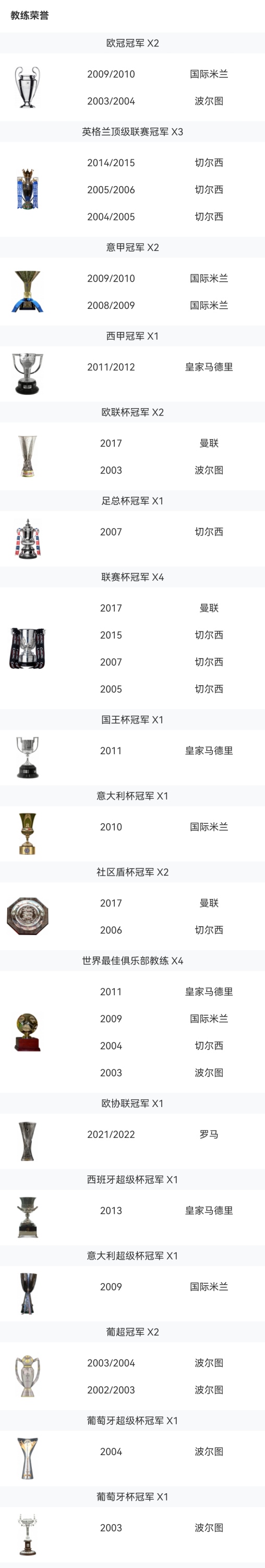 62岁的穆里尼奥最近一次率队夺冠照旧21/22赛季在罗马拿到的欧协联冠军。再往前记忆,即是曼联期间16/17赛季拿到的“小三冠”。