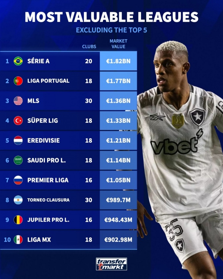 五大联赛以外联赛身价排行:巴甲18.2亿欧居首,葡超17.7亿欧第二