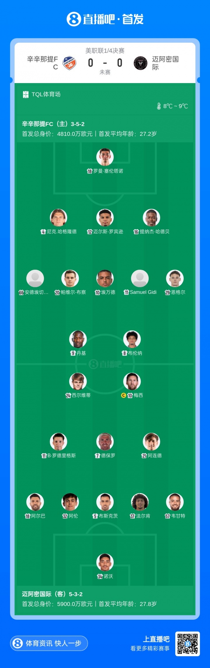 11月24日讯 北京时候11月24日6:00,好意思职联1/4决赛,辛辛那提FCvs迈阿密海外。赛前两边公布了首发名单。