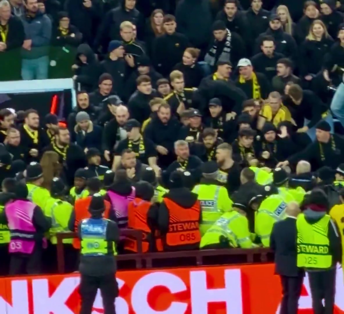 在维拉公园球场,警方介入了球迷的冲突,局面变得绝顶杂乱。之后,尽管杂乱局面一度看起来有所缓解,但不久后垂死局面再次升级。马伦显得绝顶颓唐,因为有更多杂物被扔向他,有球迷被拖走,但也有座位被拆下扔向观测。庆幸的是,顺序很快复原,比赛在暂停几分钟后重新开动,并在半场适度前赓续进行。