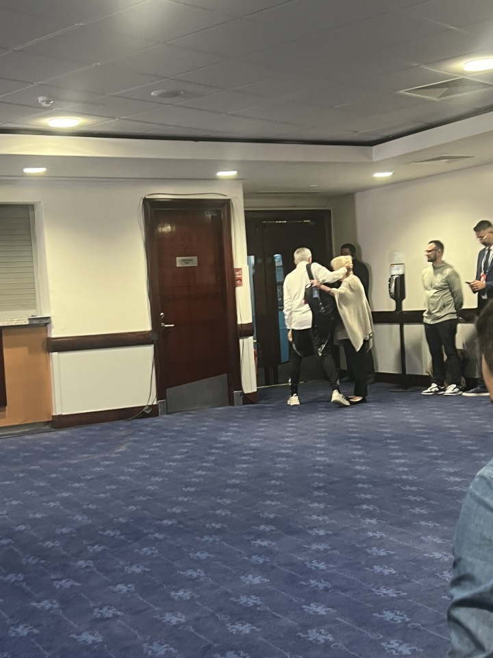 在欧冠新闻发布会截止后,穆里尼奥与切尔西的新闻官特蕾莎-康妮莉拥抱,获取了在场其他东谈主的掌声。