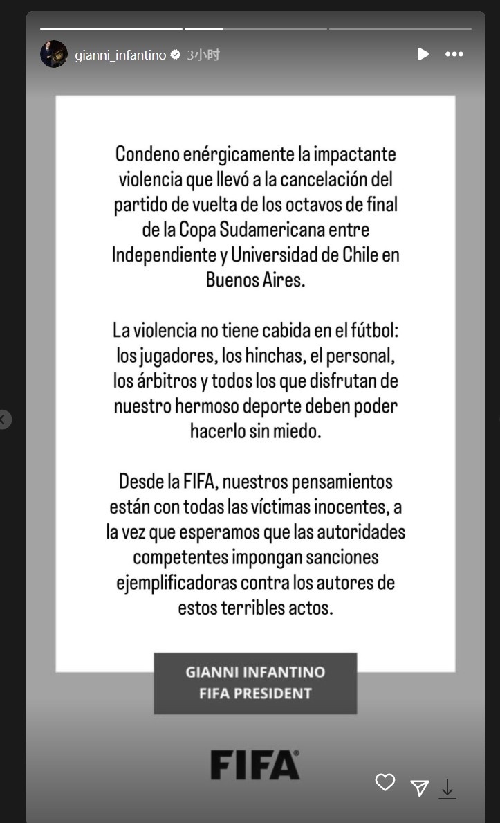 因凡蒂诺谴责南好意思杯暴力事件:关注无辜受害者,但愿重办闯事者