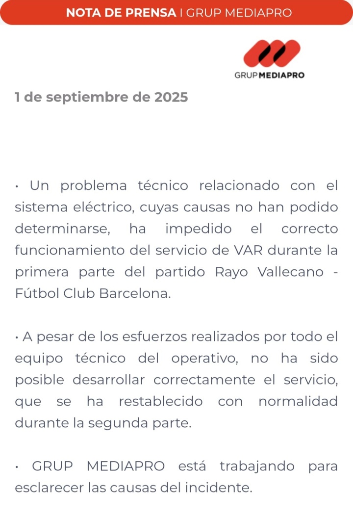 09月01日讯 巴萨1-1战平巴列卡诺,本场比赛上半场VAR出现故障,无法闲居责任未能审查亚马尔点球。西甲VAR栽种供应商Mediapro集团发表声明恢复。