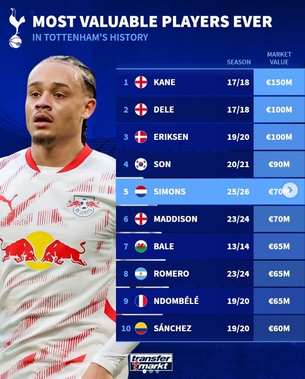 8月30日讯 本周五,热刺官方晓喻以6000万欧元从莱比锡签下哈维-西蒙斯。字据德国转会阛阓提供的数据,西蒙斯的身价为7000万欧元,在热刺队史足以排在第5位。