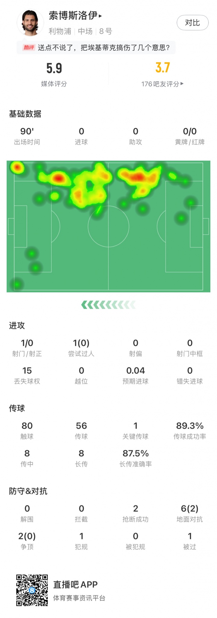 本场比赛索博斯洛伊1次射门无射正,1次过东说念主未顺利,56次传球1次要津传球,传球顺利率89.3%,6次大地抵抗2次顺利,2次争顶无顺利。