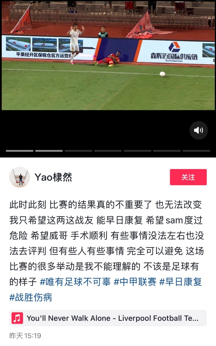 “今天中秋,两位战士王人躺在病院的病床上,被犯规后换来的是摊手,被伤害的赛后换来的也仅仅轻盈的一声慰问,后果也改造不了,对肉体形成的严重伤害不可逆转。哎,不好再说什么,早日康复,两位战友”