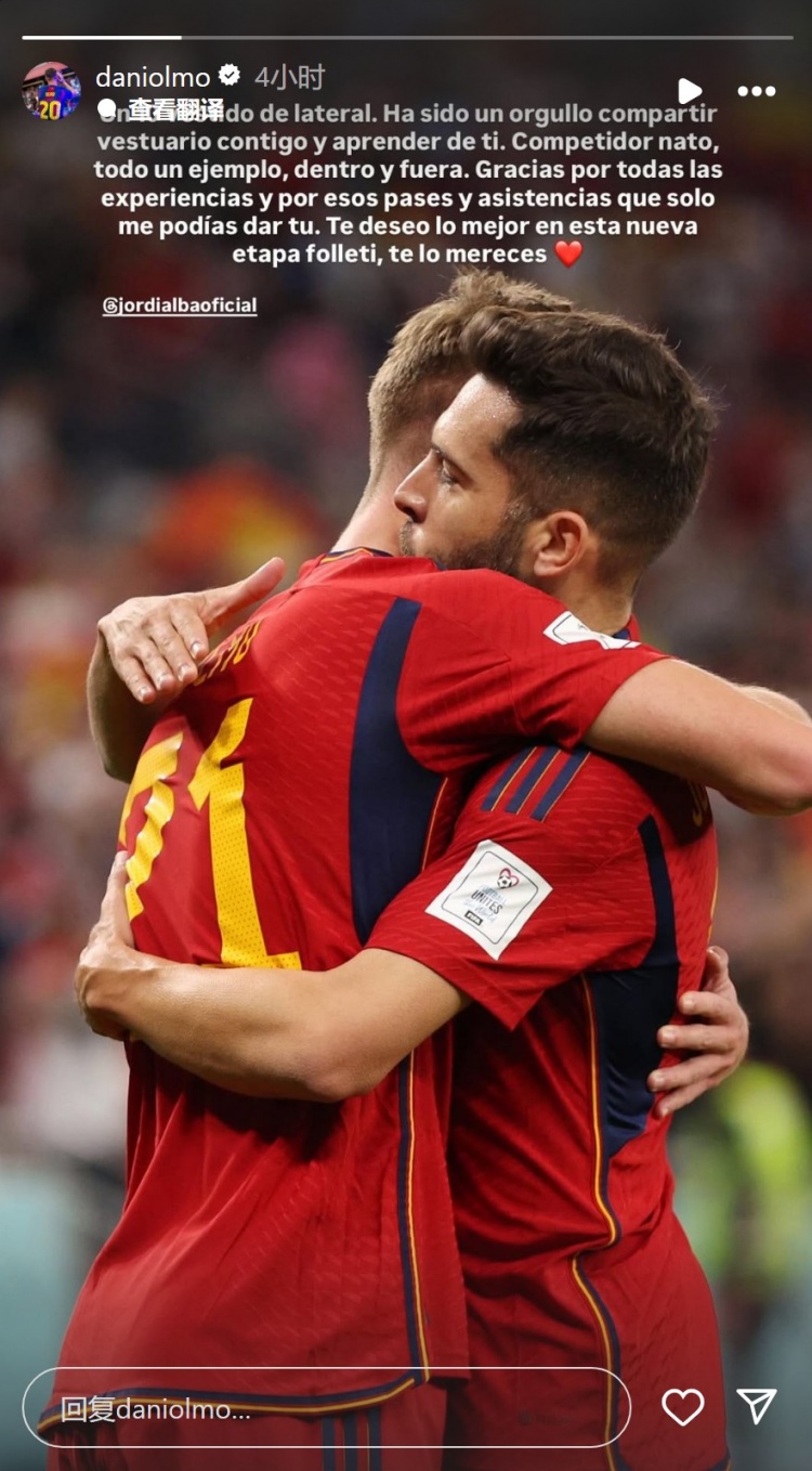 奥尔莫社媒晒出与阿尔巴在西班牙队的合照,配文:“一位10号边后卫。能与你共用更衣室并向你学习,我深感行运。天生的竞争者,场上场下都是楷模。”