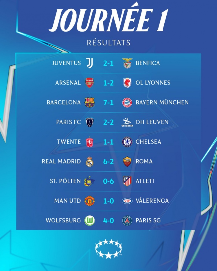 10月9日讯 女足欧冠联赛阶段首轮比赛战罢,巴萨7-1拜仁,阿森纳1-2里昂,皇马6-2罗马,尤文、曼联齐取胜。