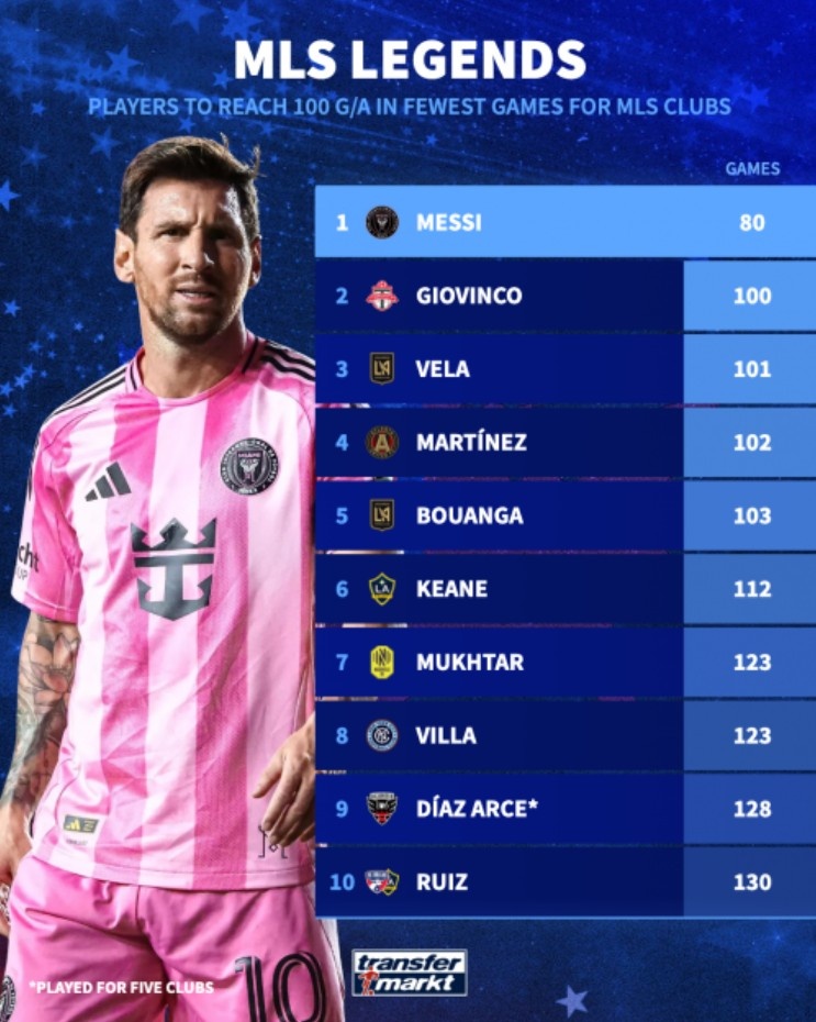 好意思职联球员参与百球场次排名:梅西80场最快,第二乔文科100场