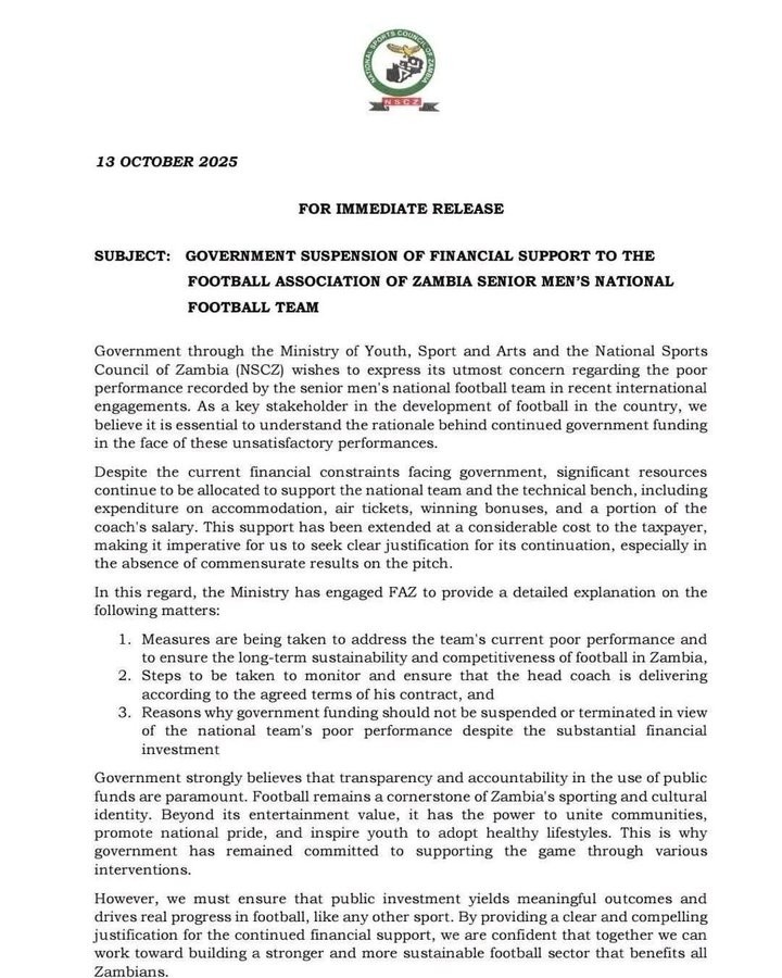 鉴于国度刻下边临的财政难题,当局示意必须对链接资助球队的根由作出合剖析释。该部门已条目赞比亚足协提交把稳讲演,确合计普及球队战绩所接管的次第、确保问责与透明度的具体目的,以及天下资源使用情况的了了评估。