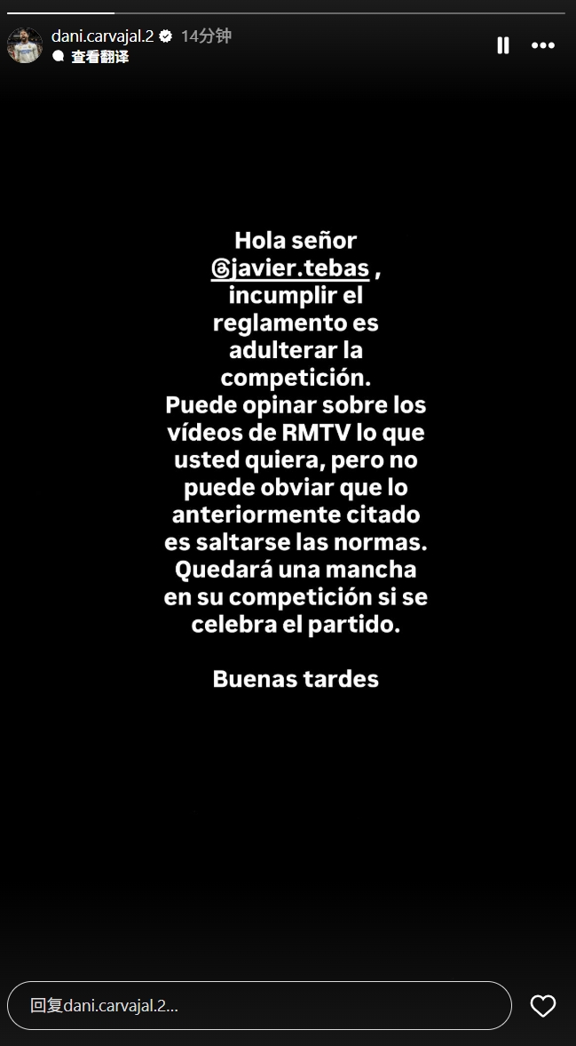 卡瓦哈尔:你好,特巴斯先生。违背章程便是污染比赛。你不错对此前皇马TV发布的视频发表你念念要说的任何主意。但你不可否定之前所提到的本色(国外赛)便是违背了门径。如若进行国外赛,你的比赛就会有漏洞。
