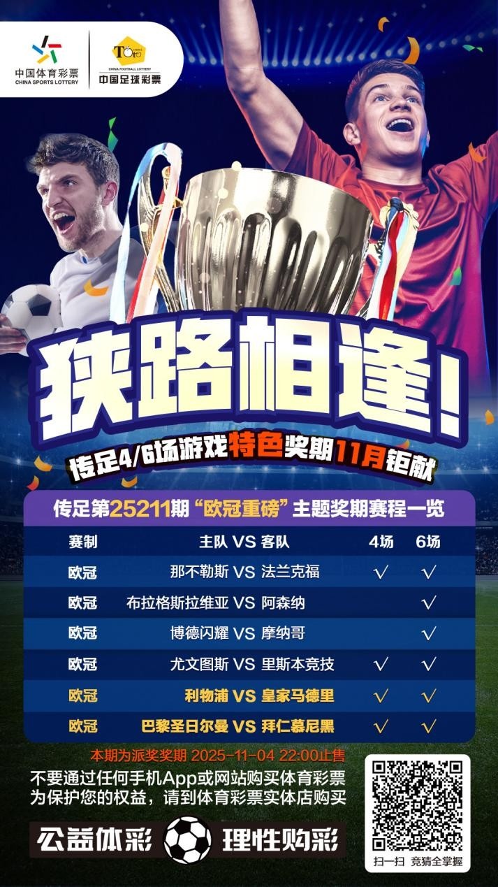 传足4/6场游戏特质奖期第25211期也曾于2025年11月2日20:00开售,将于2025年11月4日22:00停售,并于11月5日开奖,其中那不勒斯VS法兰克福、尤文图斯VS里斯本竞技、利物浦VS皇家马德里和巴黎圣日尔曼VS拜仁慕尼黑为4场进球游戏竞猜赛事。
