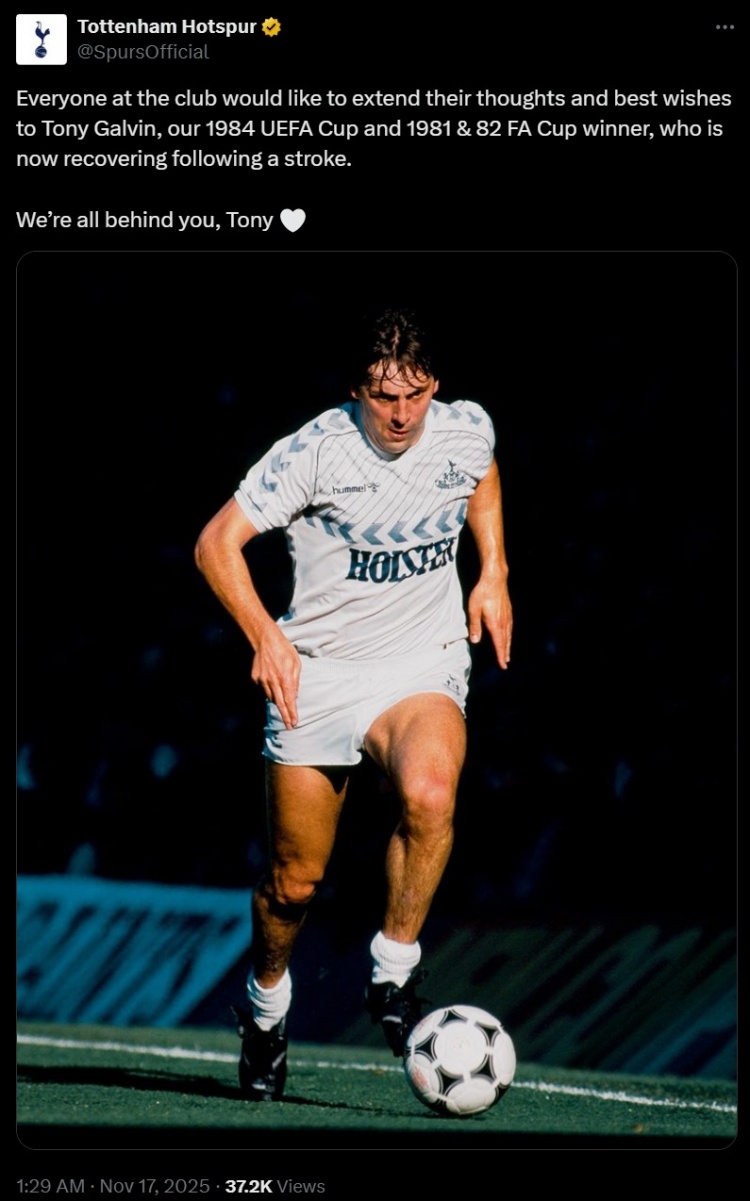 11月17日讯 热刺旧将托尼·加尔文现在正处于中风后的康复进度中,热刺在官方社媒发文为其奉上祈福。
