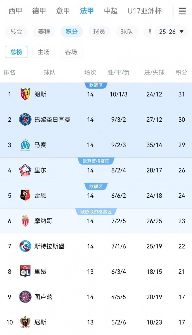 朗斯也在14轮联赛事后以10胜1平3负,积31分卓绝巴黎,登顶法甲联赛积分榜首。数据统计泄漏,这亦然他们自2004年以来初次登顶法甲积分榜首。