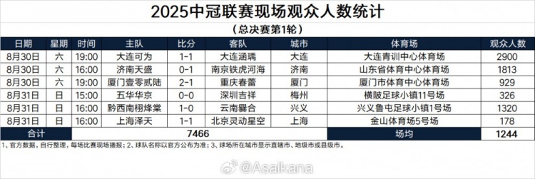 2025中冠联赛现场不雅世东谈主数统计(总决赛第1轮)