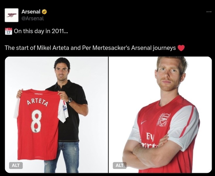 阿森纳官推晒照:2011年的今天,阿尔特塔&默特萨克开启枪手生存