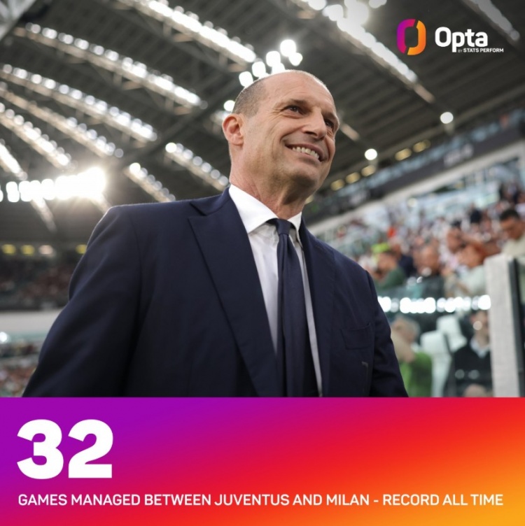 阿莱格里执教米兰和尤文交手的场次为32场,其中21场是动作尤文主帅,剩余11场则是担任米兰主帅,此前记录保握者是特拉帕托尼。