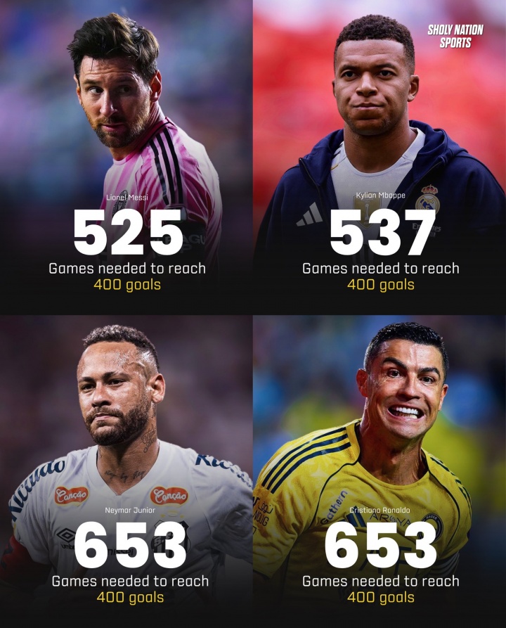 解锁400球时场次:梅西525场最快,姆巴佩537场,C罗内马尔653场